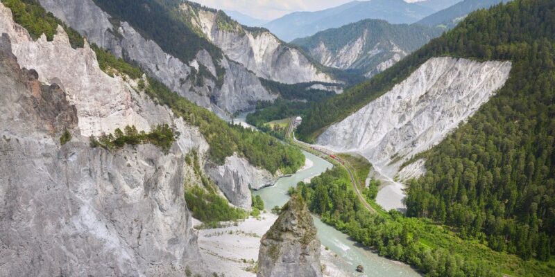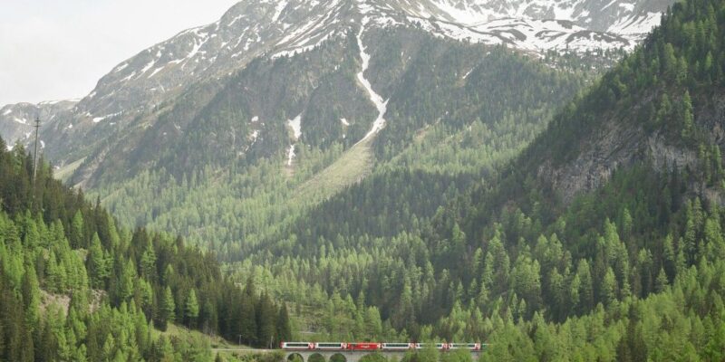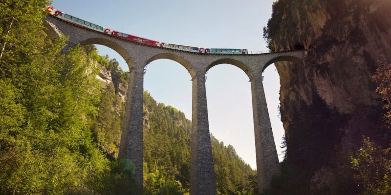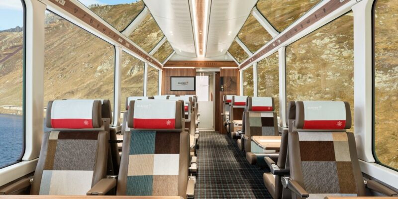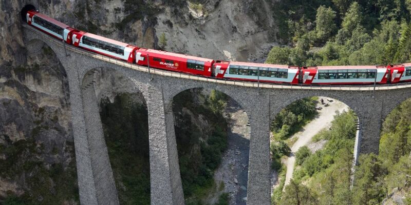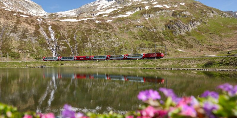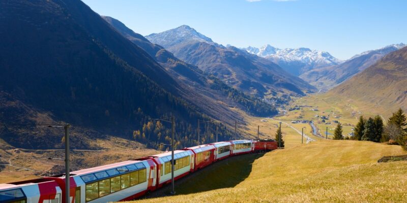 Vožnja z »ledeniškim vlakom« (Glacier Express) je ena od najbolj ikoničnih panoramskih železniških poti v Švici in svetu — poznana je kot »najpočasnejši hitri vlak na svetu«, ki ponuja spektakularne razglede na alpske pokrajine